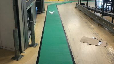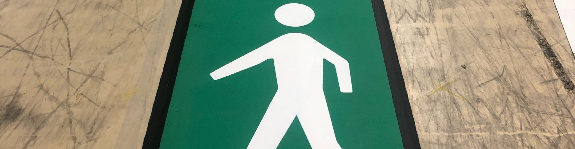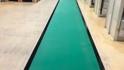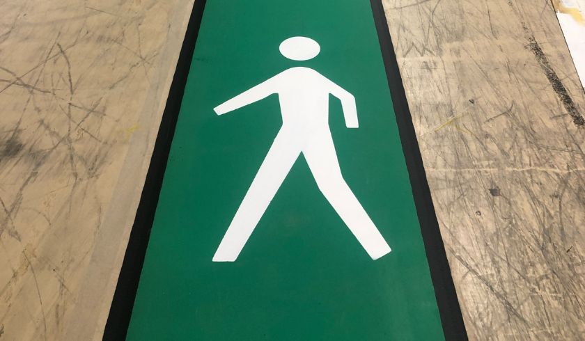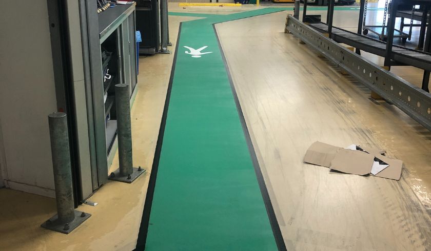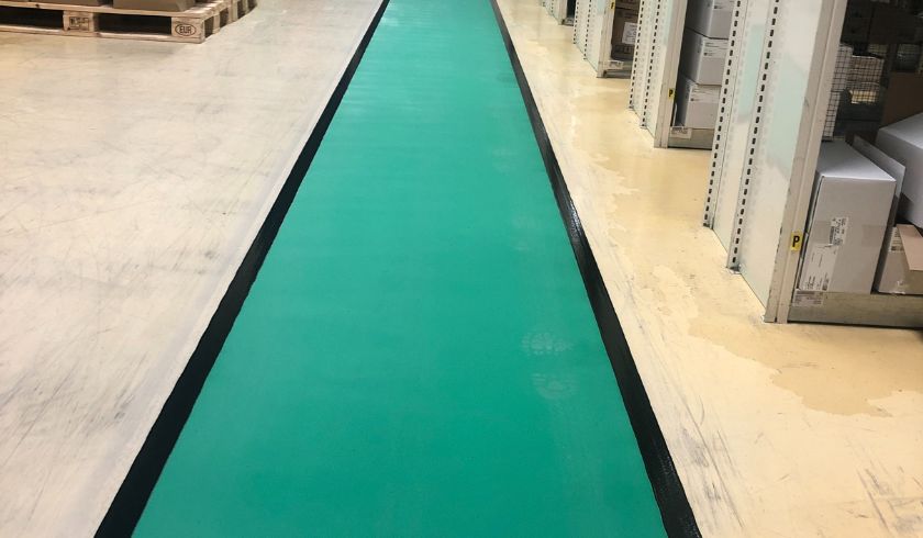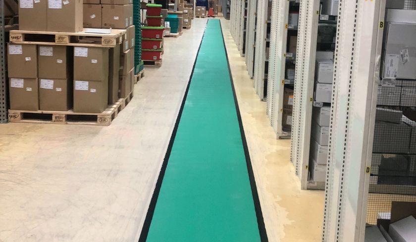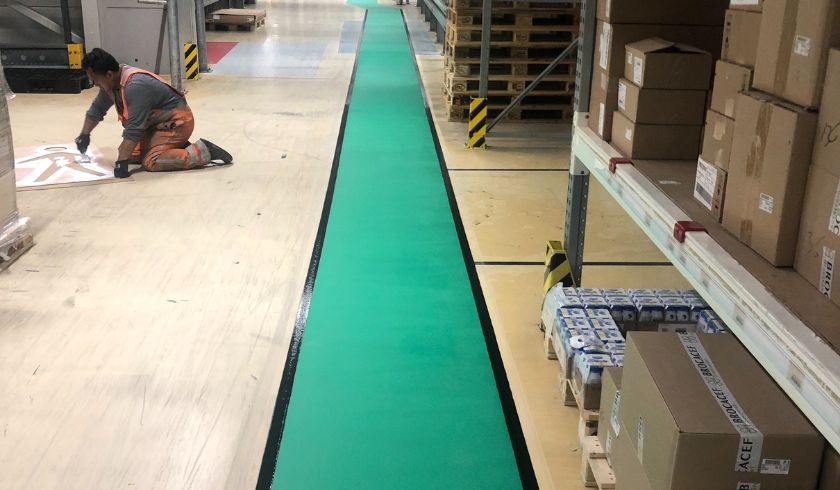 Deze magazijnbelijning dient ter veiligheid voor het scheiden van de voetgangers en de heftrucks. In magazijnhallen wordt vaak gebruik gemaakt van heftrucks. Om duidelijk weer te geven waar de machines mogen rijden zonder dat ze hiermee kans hebben om een voetganger te raken is er een duidelijke belijning aangebracht. De looppaden zijn eerst aangebracht middels een groen vlak. Vervolgens zijn de zwarte randen aangebracht en is de voetgangersmarkering toegevoegd.