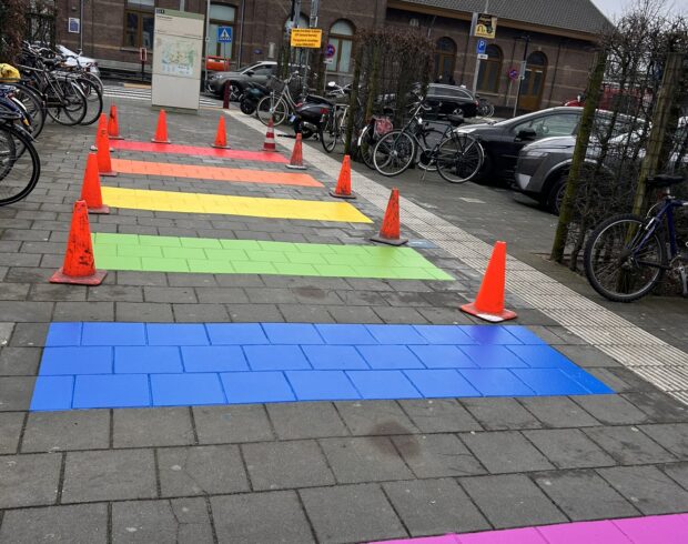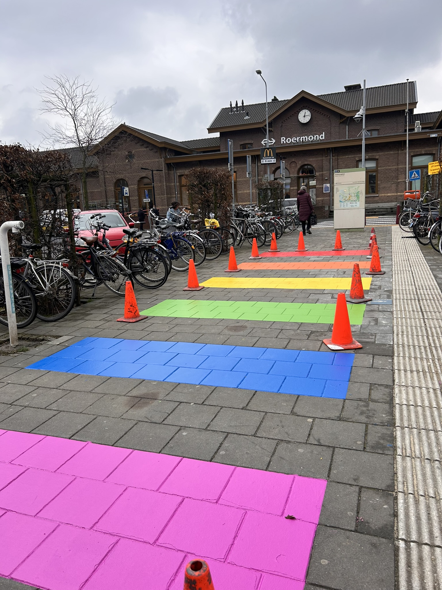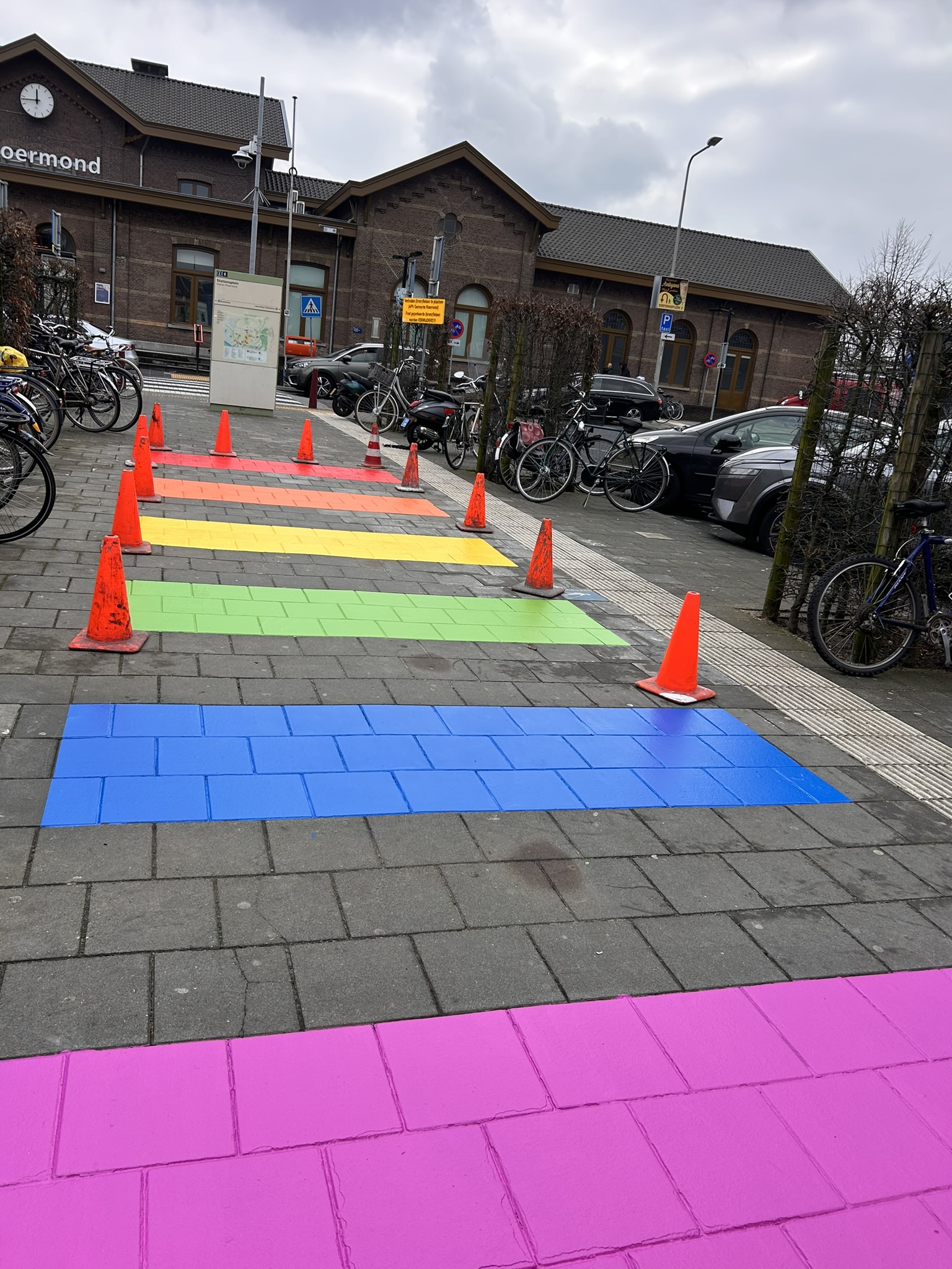 Regenboog oversteekplaats markering op Stationsplein Roermond